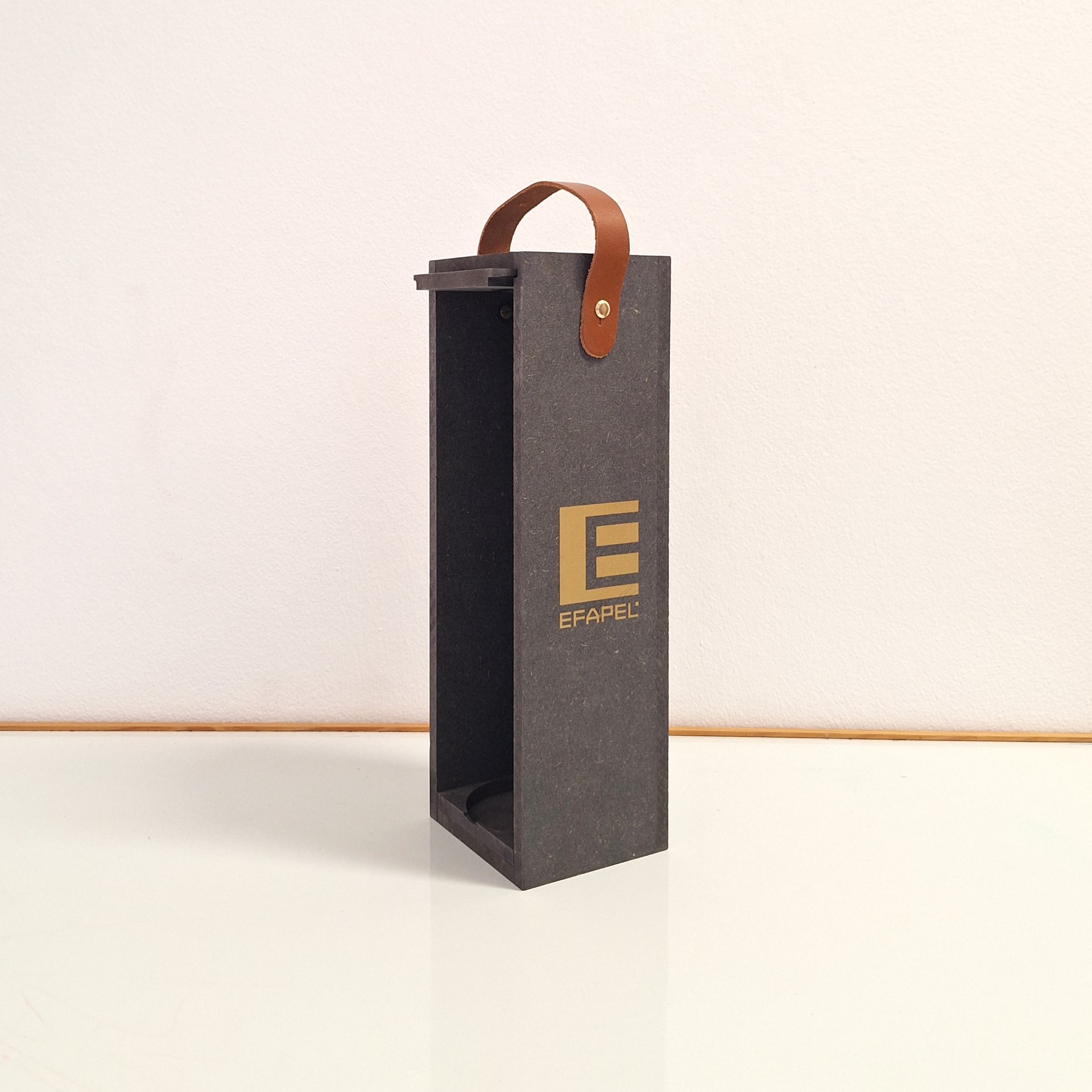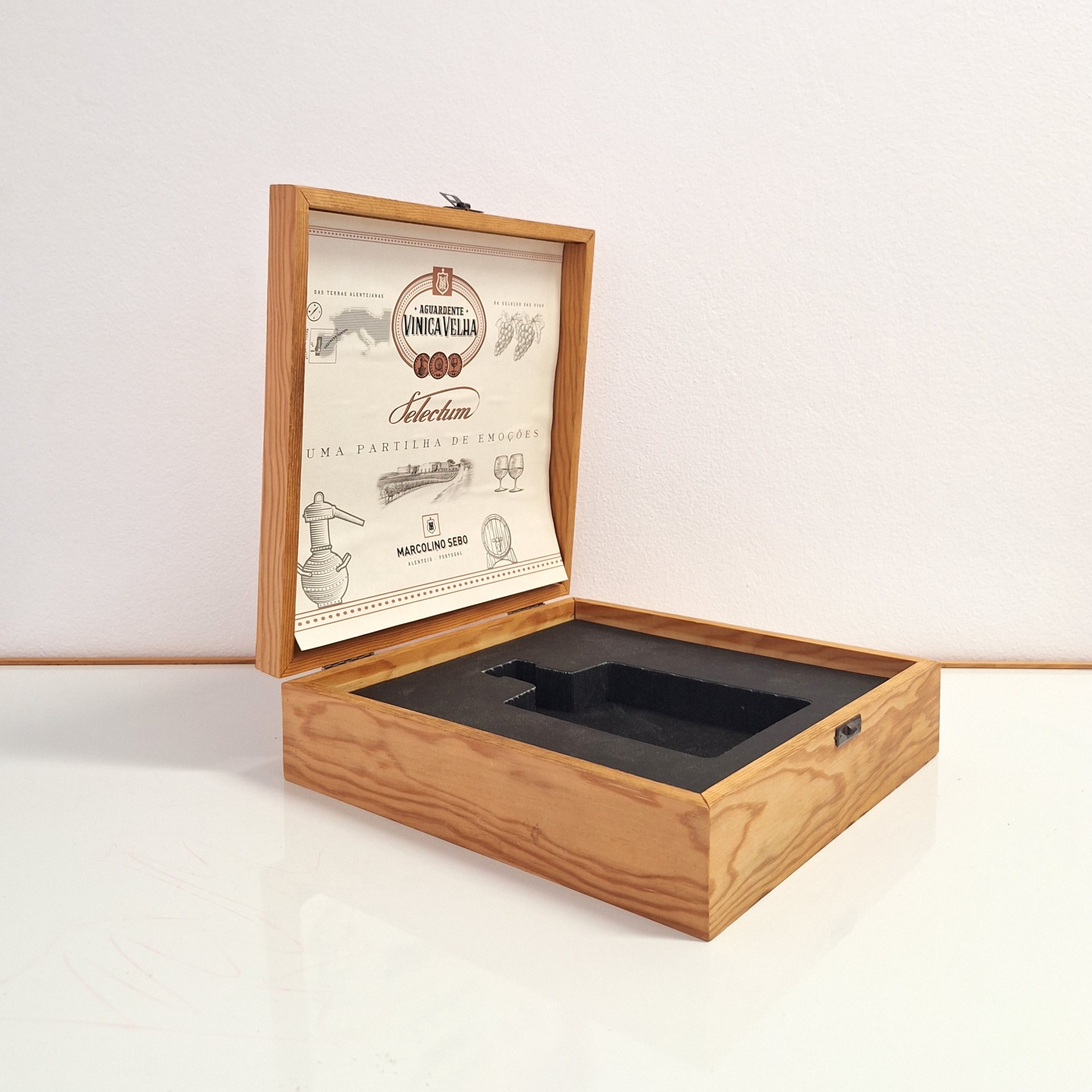 Interior em espuma recortada para colocação da garrafa com diversos acabamentos.